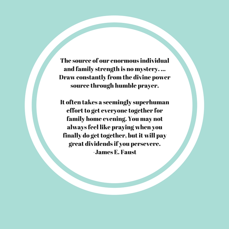 “The source of our enormous individual and family strength is no mystery. … Draw constantly from the divine power source through humble prayer. It often takes a seemingly superhuman effort to get everyone together for family home evening. You may not always feel like praying when you finally do get together, but it will pay great dividends if you persevere.”